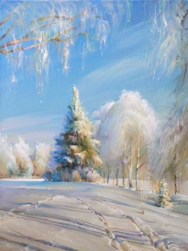 В хрустальном инее деревья и дороги,